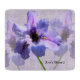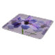 Glass cutting board with blue Irises and a place to add your name.  The background is a grunge lavender so it's a very pretty board.