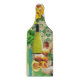 A fun glass paddle cutting board with wine and cheese against a background of green and white Mexican tile. A wonderful gift or for your own use at home.