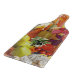 A paddle-shaped glass cutting board with a brilliant orange/yellow culinary design. A great gift or for you own use at home for everyday or parties. Ideal at a bar set-up to cut lemons and limes.