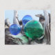 Blue and green glass floats are placed on a piece of grey driftwood at the beach.
