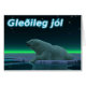 A peaceful moment in the long Arctic night. A Polar Bear rests at the edge of an open area in the pack ice. The Northern Lights glow in the distance; bright stars twinkle overhead. Icelandic text reading "Gleðileg jól" (Merry Christmas) appears in glowing blue and white. Polar bears are endangered. How much longer will scenes like this be able to occur? Please help save Polar Bears from extinction.