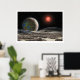 Gliese 581 c, shown from the perspective of a possible moon, is thought to be a rocky world about 1.5 times the radius of Earth. Its temperature is uncertain, yet it resides near the star’s habitable zone, making the existence of oceans and lakes a possibility. From a mixed media illustration created for “The Search for a World Like Our Own: Imagine Earth 2.0,” at swissnex San Francisco on May 15, 2008. The original art is in a private collection.