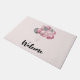 A welcome doormat with an illustration of a bunch of balloons in pink and silver grey colours.