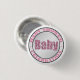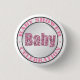 Pink Baby Shower buttons featuring a printed glitter illustration for the "Baby" in a "BABY SHOWER CELEBRATION" emblem design. (Not real glitter)