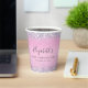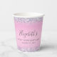 Pretty, glamourous and girly sweet 16 birthday party paper cups with sparkly holographic purple, pink and silver faux glitter confetti borders against a pink background and her name in a soft grey trendy script.