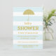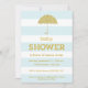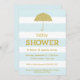 This modern invitation features a glitter-look umbrella and a subtle blue stripe background.