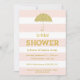 This modern invitation features a glitter-look umbrella and a subtle pink stripe background.