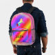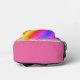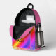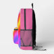 On this back pack is a colourful mythical unicorn on a pastel rainbow backdrop with gold glitter edging for extra glam. Can be personalized on the front pocket. Whimsical girly dreamy vibes.