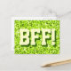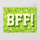 Postcard with a modern design featuring stars scattered over a stylised "sequin look" pattern background and 'BFF!' in shades of lime green. Can be used as a background for your own text, images and ideas. Please note this is a printed digital art image, it does not shine or contain real glitter or sequins.