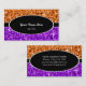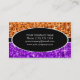 Modèle de carte de visite avec un design moderne avec des étoiles éparpillées sur un arrière - plan stylisé "à paillettes" dans les tons orange et violet avec un ovale noir et rayé bordée de texte blanc et blanc. Le texte peut facilement être modifié à l'aide du modèle fourni ou cliquez sur le bouton "Customiser" pour effectuer d'autres modifications. Veuillez noter qu'il s'agit d'une image d'art numérique imprimée, elle ne brille pas ou ne contient pas de parties scintillant ou de paillettes réelles.