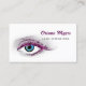 Eye catching cosmetology business cards for the eye extensions specialist featuring a gorgeous blue eye with purple faux glitter eyelashes. personalize by adding your name and specialty. Flat printed image, NOT reflective glitter.