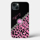 Glamourous Samsung Galaxy Note 4 case done in black, with a spotted pink and black jaguar print running diagonally across the bottom right side of the case. Graphics of a diamond border, on the edge of the jaguar print, has a pink and silver tone gem, in the middle. Personalize the pink text for yourself or as a purrfect gift idea.