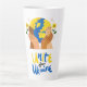 Modern hand drawn latte mug design showing global support for the people of Ukraine features multiple hands holding a globe in colours of Ukraine flag with "Unite for Ukraine" text
