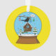 Illustration d'un mignon globe de neige avec un oiseau-noir chantant sur le sommet d'une maison d'oiseaux sainte accrochée à une branche avec des boules de noël colorées dans un paysage enneigé et des pins. Ce dessin animé est une idée cadeau pour les amateurs de Noël ou de Noël et les amateurs de vacances d'hiver.