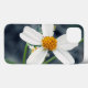 The image on this iPhone 13 Case is an original photograph by MaeFlowers of a wildflower. It is a tiny white flower with five petals and a yellow orange pompom in the centre. The photo is a closeup, with the flower itself in sharp focus, the flower's green stem and leaves in soft focus, and the rest of the background in soft shades of dark bluish grey. The flower is a weed, filling the lawn with whiteness.