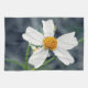 The image on this Kitchen Towel is an original photograph by MaeFlowers of a wildflower. It is a tiny white flower with five petals and a yellow orange pompom in the centre. The photo is a closeup, with the flower itself in sharp focus, the flower's green stem and leaves in soft focus, and the rest of the background in soft shades of dark bluish grey. The flower is a weed, filling the lawn with whiteness.