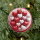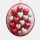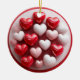 Glossy red, white, and pink heart shapes arranged on a circular white surface over a red background, depicting love, emotion, and celebration. Ideal for Valentine's, romantic events, or decorative purposes.