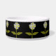 This awesome pet bowl features a digital image of a daisy with a green stem with two green leaves on it and white and yellow coloured petals with a yellow centre. The petals look like they are glowing with a beautiful reflective quality. The flower is on a black background for maximum contrast and the result is stunning.
