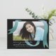 A modern invitation featuring a teal blue ribbon loosely hanging over your favourite photo with a black background.