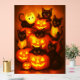 A whimsical Halloween poster featuring curious black cats nestled among glowing jack-o’-lanterns. With warm golden light and playful feline expressions, this enchanting artwork blends charm and spookiness, making it a perfect seasonal decoration for cat lovers and Halloween enthusiasts alike.