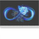 Luminous infinity symbol with glowing, beautiful, lushly blooming rose made of blue flames on black background.