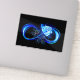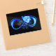 Luminous infinity symbol with glowing, beautiful, lushly blooming rose made of blue flames on black background.
