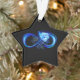 Luminous infinity symbol with glowing, beautiful, lushly blooming rose made of blue flames on black background.