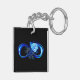 Luminous infinity symbol with glowing, beautiful, lushly blooming rose made of blue flames on black background.