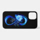 Luminous infinity symbol with glowing, beautiful, lushly blooming rose made of blue flames on black background.
