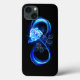Luminous infinity symbol with glowing, beautiful, lushly blooming rose made of blue flames on black background.