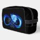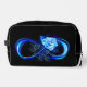 Luminous infinity symbol with glowing, beautiful, lushly blooming rose made of blue flames on black background.