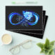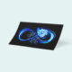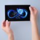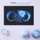 Luminous infinity symbol with glowing, beautiful, lushly blooming rose made of blue flames on black background.