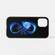 Luminous infinity symbol with glowing, beautiful, lushly blooming rose made of blue flames on black background.