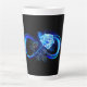 Luminous infinity symbol with glowing, beautiful, lushly blooming rose made of blue flames on black background.