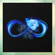 Luminous infinity symbol with glowing, beautiful, lushly blooming rose made of blue flames on black background.