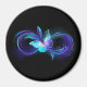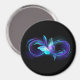 Infinity symbol with magical, purple glowing butterfly with transparent wings, on black background. Glowing butterfly.