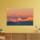 Winter landscape photograph of a stunning snowy mountain range lit by sun making it glowing orange almost red with snow covered spruce forest in foreground.