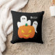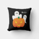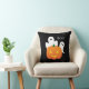 A throw pillow for your home Halloween decor, which captures the essence of the season with a delightful lit pumpkin surrounded by playful ghosts, all joyfully exclaiming, Boo!