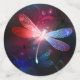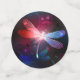 Glowing, flying, red dragonfly, with transparent, detailed wings on dark, nocturnal, luminous background with tropical plants and fireflies. Red dragonfly.