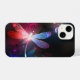 Glowing, flying, red dragonfly, with transparent, detailed wings on dark, nocturnal, luminous background with tropical plants and fireflies. Red dragonfly.