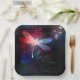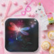Glowing, flying, red dragonfly, with transparent, detailed wings on dark, nocturnal, luminous background with tropical plants and fireflies. Red dragonfly.