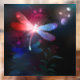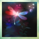 Glowing, flying, red dragonfly, with transparent, detailed wings on dark, nocturnal, luminous background with tropical plants and fireflies. Red dragonfly.