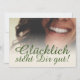 Kompliment Karte mit lachendem Frauengesicht und handschriftlichen Grüßen auf der Vorderseite der Karte. Restliche Flächen stehen zur freien Verfügung.