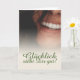 Kompliment Karte mit lachendem Frauengesicht und handschriftlichen Grüßen auf der Vorderseite der Karte. Restliche Flächen stehen zur freien Verfügung.
