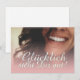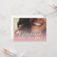 Kompliment Karte mit lachendem Frauengesicht und handschriftlichen Grüßen auf der Vorderseite der Karte. Restliche Flächen stehen zur freien Verfügung.