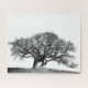 An enhanced black and white photograph of a beautiful, if gnarly, oak tree.