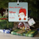 Metal Christmas square ornament featuring gnome with santa hats on a grey background, with a winter tree and snowflake. Includes personalized photo.