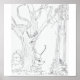 a pen drawing i did of a gnome running away through a forest / tree area