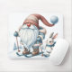 A whimsical watercolor bearded gnome with a winter hat is skiing with a cute bunny in snowflakes.