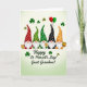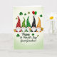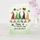 This card shows five St. Patrick’s Day gnomes lined up shoulder to shoulder across the centre, their round bodies and long white beards giving them a cozy, companionable look 💚. On the left, a gnome in a red polka-dot hat raises a golden mug, as if toasting the others, while two green-hatted gnomes beside him wear swirling patterns that echo the shamrocks around them ☘️. Near the right side, a gnome in a black hat holds red and green balloons that float upward like a small parade, and the last gnome wears an orange-striped hat while presenting a shiny pot of gold. Their hats and props pop against a light green gradient background, with soft shading that makes the figures look gently rounded and close together, like friends leaning in for a photo. Small shamrocks in different green tones are scattered around the lineup, filling the space without crowding the characters. The message “Happy St. Patrick’s Day! Great Grandma!” sits in dark green lettering, placed above and slightly over the group so it reads clearly at a glance. The gold mug, balloon strings, and the pot’s bright highlights add little points of shine among the reds, greens, black, and orange. A sprinkling of shamrocks frames the gnomes on both sides against the pale green backdrop.